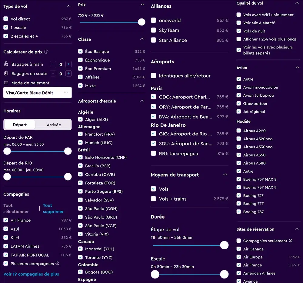 Après avoir entré les aéroports et les dates, il est temps de jouer avec les filtres. Les filtres sont vos meilleurs amis pour ajuster la recherche selon vos préférences et besoins :