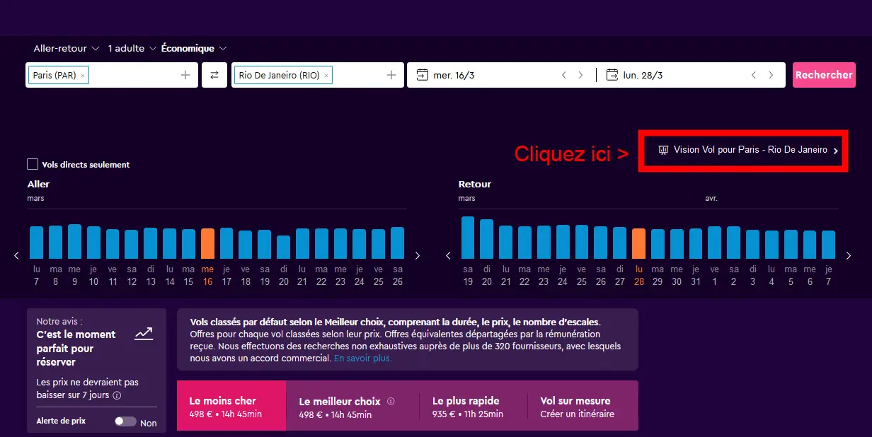 Une fois tous ces paramètres renseignés, vous pouvez lancer la recherche. Le comparateur vous montrera les différentes options, parfois avec des suggestions comme « le meilleur tarif », « le vol le plus rapide », ou « le meilleur compromis ». Je clique ensuite sur l’option qui m’intéresse — par exemple, « vision vol pour Paris – Rio de Janeiro » dans ce cas.
